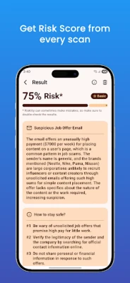 Dengan Risklity, anda boleh mengambil langkah proaktif terhadap penipuan dalam talian. Jika anda menerima teks, SMS, atau e-mel yang meragukan, hanya salin dan tampal kandungan ke dalam aplikasi. Risklity akan menganalisis perkataan, nada segera, dan konteks untuk memberi amaran kepada anda tentang percubaan penipuan, pancingan data (phishing), atau serangan kejuruteraan sosial. Selain itu, jangan lagi bimbang untuk mengklik pautan yang tidak dikenali; pengimbas pautan berniat jahat kami akan menyemak URL serta-merta untuk laman web pancingan data yang diketahui, perisian hasad (malware), atau domain penipu sebelum anda membukanya, memastikan pengalaman dalam talian yang lebih selamat.