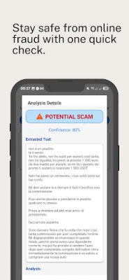 Risau tentang mesej sembang mencurigakan? Aplikasi Scam or not? menggunakan AI untuk mengesan penipuan dengan mudah. Hanya muat naik tangkapan skrin sembang dan dapatkan pengesanan segera, skor keyakinan, serta keputusan yang boleh dipercayai untuk kekal selamat. Berhenti meneka, mulakan mengesahkan.