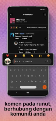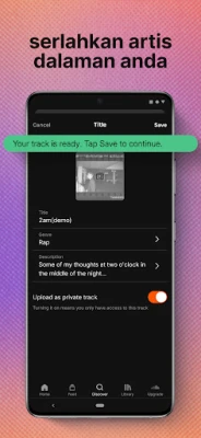 Bina pustaka bunyi peribadi anda dengan mudah; simpan lagu trending terkini, permata tersembunyi, dan pelbagai genre untuk koleksi yang sentiasa berkembang. SoundCloud bukan sekadar aplikasi muzik; ia adalah komuniti global di mana anda boleh mengikuti artis kegemaran, berinteraksi terus dengan pencinta muzik lain, serta berkongsi dan menemukan senarai main mereka. Libatkan diri dengan runut melalui 'Suka', 'Pos semula', dan komen secara langsung dalam pemain, atau sebarkan irama hangat di media sosial anda. Bagi pencipta, SoundCloud menawarkan platform yang tiada tandingannya untuk memuat naik karya anda sendiri, menghubungkan anda dengan jutaan peminat di seluruh dunia dan membantu artis bebas menerima ganjaran hasil sokongan pendengar.