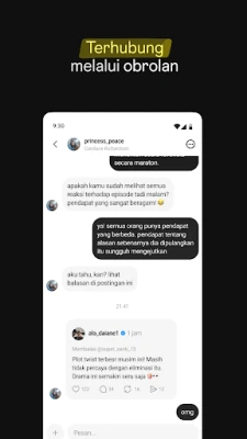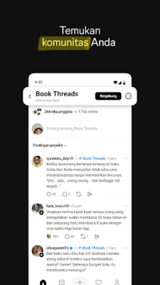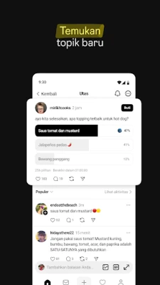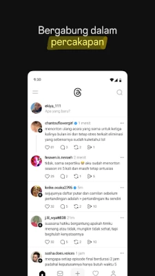 Sertai perbincangan terbaik dengan memberikan balasan, reaksi, dan interaksi terhadap kandungan orang lain. Temui komuniti anda, sambungkan dengan individu yang berfikiran sama, dan selami lautan idea serta inspirasi. Dari cadangan rancangan TV hingga nasihat kerjaya, Threads adalah sumber untuk mendapatkan jawapan, mempelajari perkara baharu daripada perbualan orang ramai, pemimpin pemikiran, dan pakar industri. Kekal celik dan tidak ketinggalan tren terkini atau acara langsung melalui diskusi yang aktif dan notifikasi segera apabila profil kegemaran anda memulakan utas baharu.